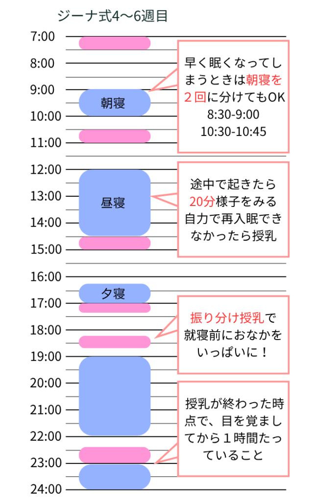 ジーナ式の生後4〜6週目の授乳と睡眠のスケジュールは以下の通りです。